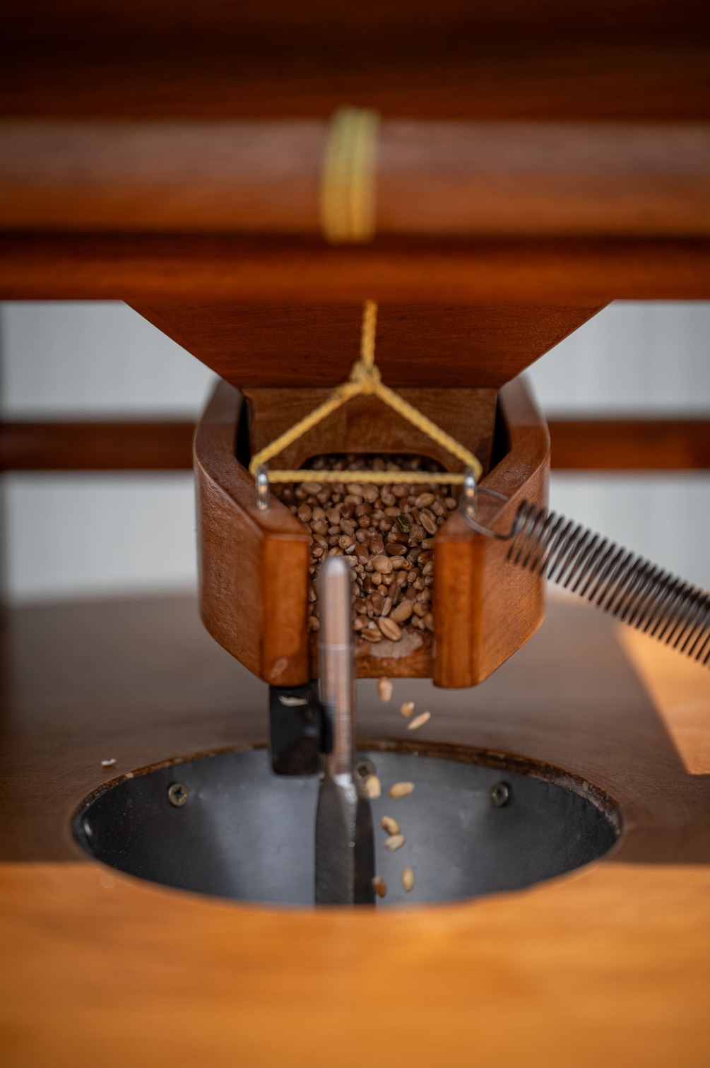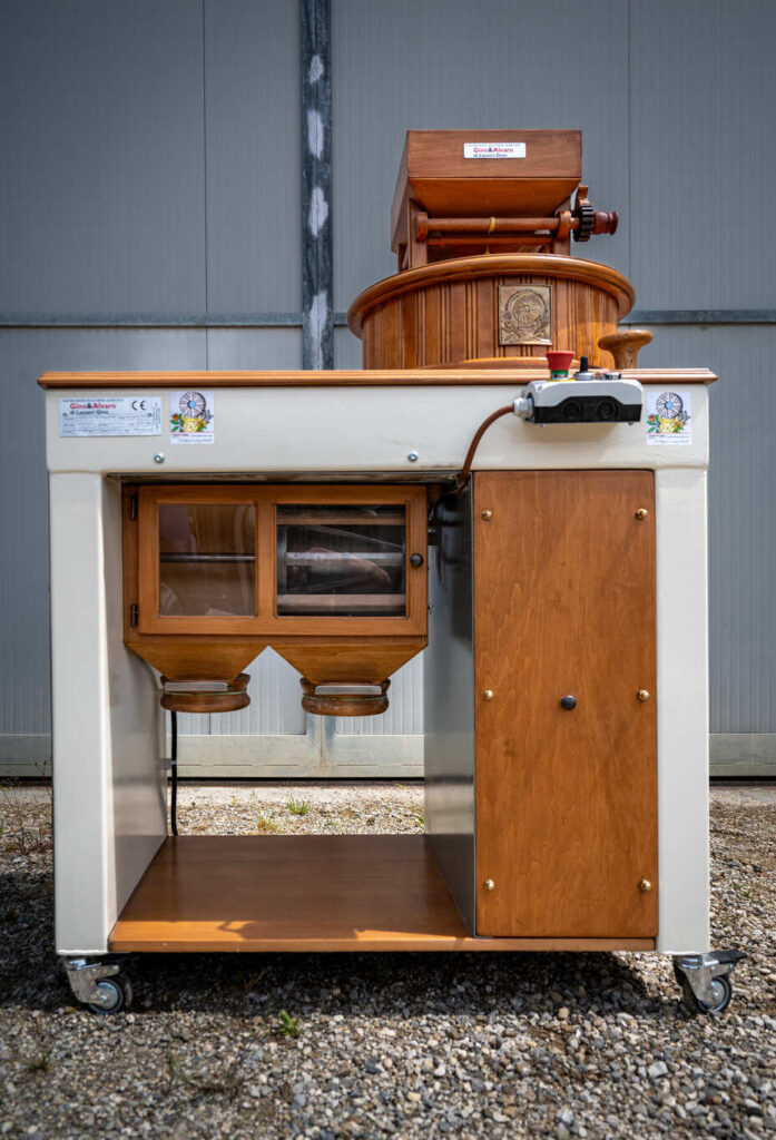 Il prodotto da macinare viene caricato in una tramoggia di legno austriaco che, tramite una bocchetta regolabile dall’operatore, dà la giusta alimentazione al mulino.